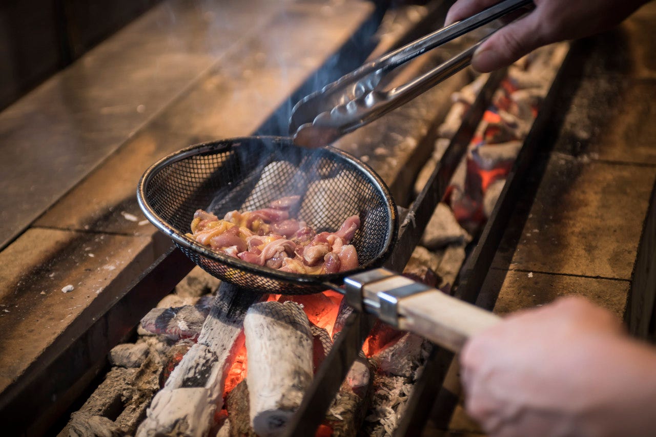 親鳥の炭火焼は、旨味のある親鳥を炭火でじっくり焼きあげました。炭火の香りと噛み応えのある食感がやみつきです。コースではグラタンや親鳥炭火焼からお好みのメニューを選択できます。