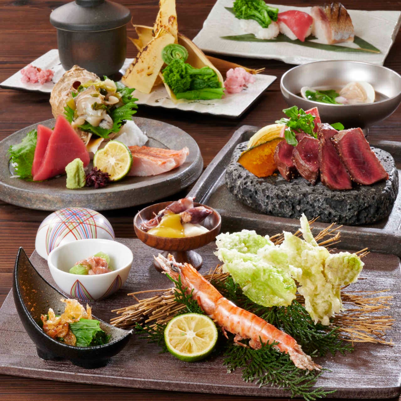 全国各地から仕入れる野菜、魚、和牛は素にして贅の味わいです。宴席、接待、会食などにご利用頂けるコース料理は5500円(税込)~ご用意。2時間の飲み放題プランもございます。