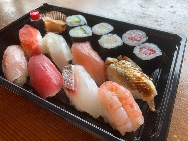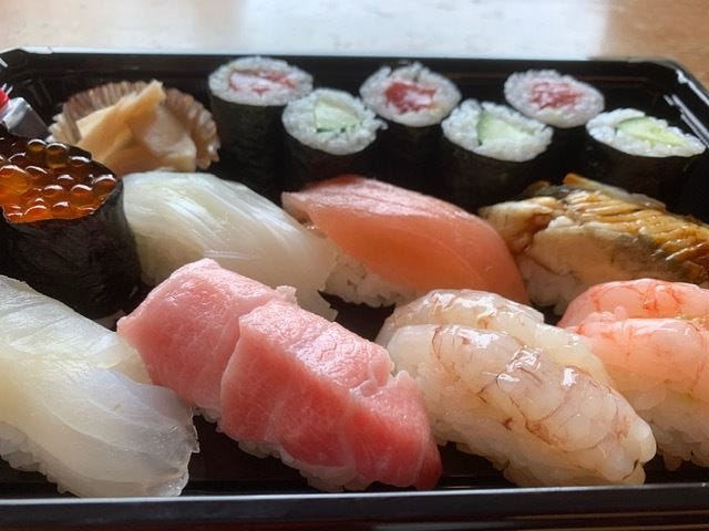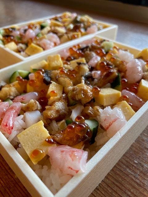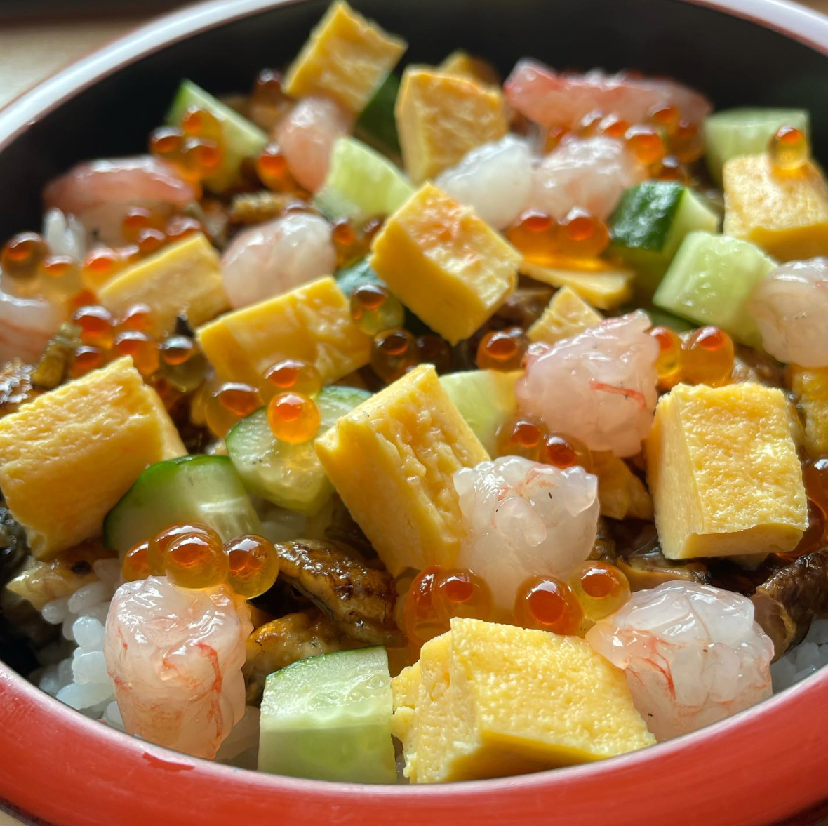 ①甘えび、②ウナギ、③いくら、④卵焼き、⑤胡瓜、⑥煮椎茸、⑦かんぴょう