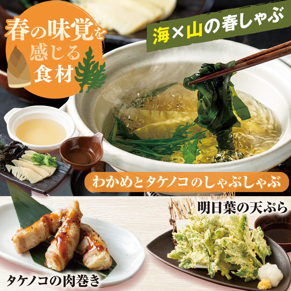 注目は、八丈島の提携農園から毎年仕入れる新鮮な「明日葉」の天ぷら。サクサク食感と心地よいほろ苦さが、この時期ならではの味わいです。さらに磯の香りと歯ごたえが楽しめる「わかめとタケノコのしゃぶしゃぶ」や、春の旨味を閉じ込めた「タケノコの肉巻き」など、旬の味覚を用意して皆様のご来店をお待ちしております!