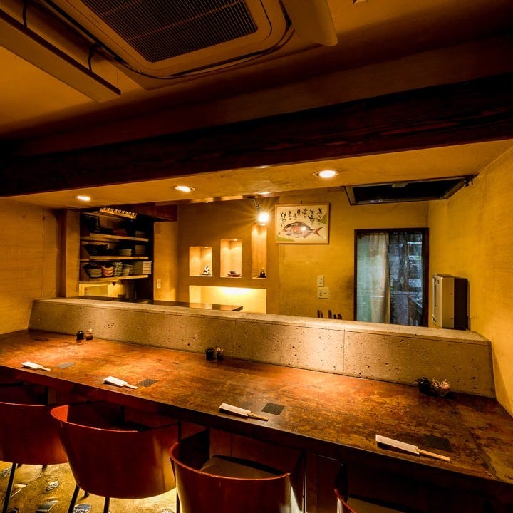 • 大人の雰囲気漂うゆったりとした広いカウンター席。熟練職人の技を楽しみながら四季折々のお料理と厳選地酒に舌鼓。ご夫婦でのお食事や記念日のお祝い、気の置けないご友人との語らいなど大切な方とのひと時を極上のお料理と空間でお楽しみください。